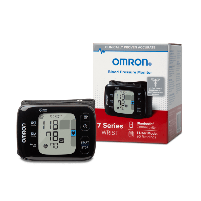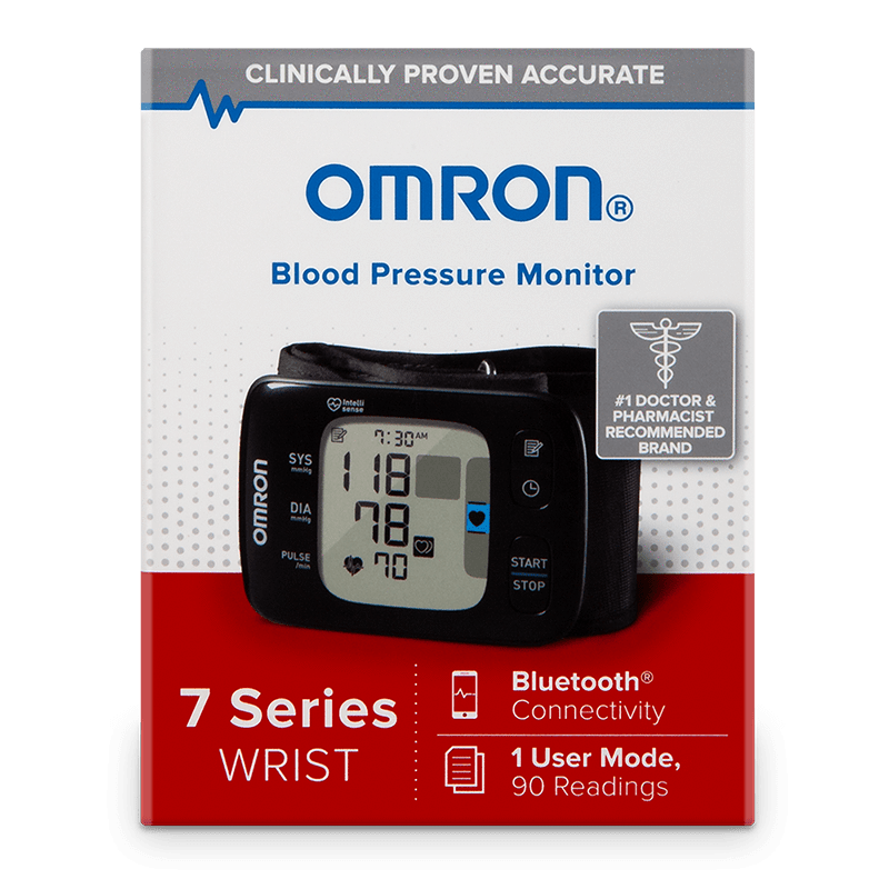 The OMRON 7 Series Wireless Bluetooth® Wrist home blood pressure monitor will measure, store and let you review 90 readings for one user, and fits adult wrists from 5.3” to 8.5” in circumference.
